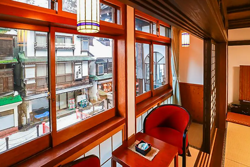能登屋旅館四周被群山包圍,沿著水量豐富的銀山川流向上流處前行,川流兩岸的景色,像時光靜止一樣,呈現出古色古香的傳統溫泉街景象。