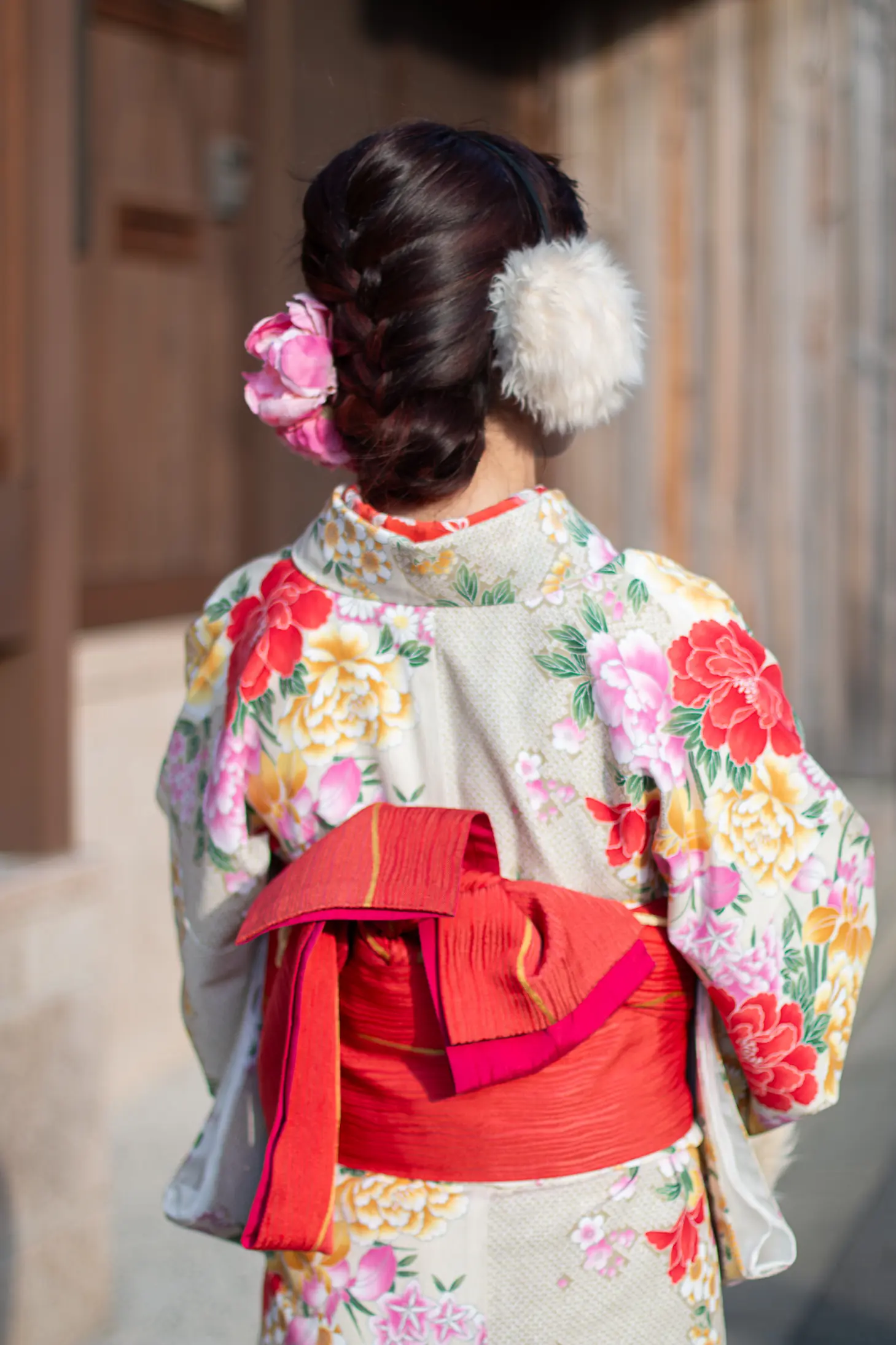 這次選的這套牡丹和服,布料其實一點也不硬挺,摸起來偏柔軟。但經過婆婆細心打理後,整體線條立刻變得挺拔。拍起照來還挺好看的誒