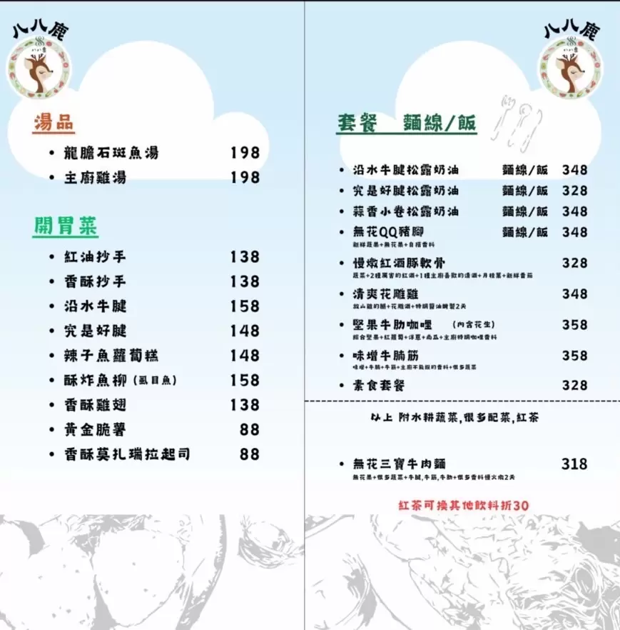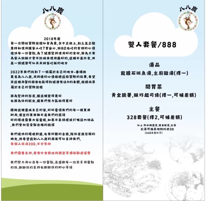 喔~對了 由於八八鹿餐點主廚全程手做出餐時間會須稍長一些,建議大家來訪時,請放慢步調,好好享受這段美味與悠閒並行的時光喔!。