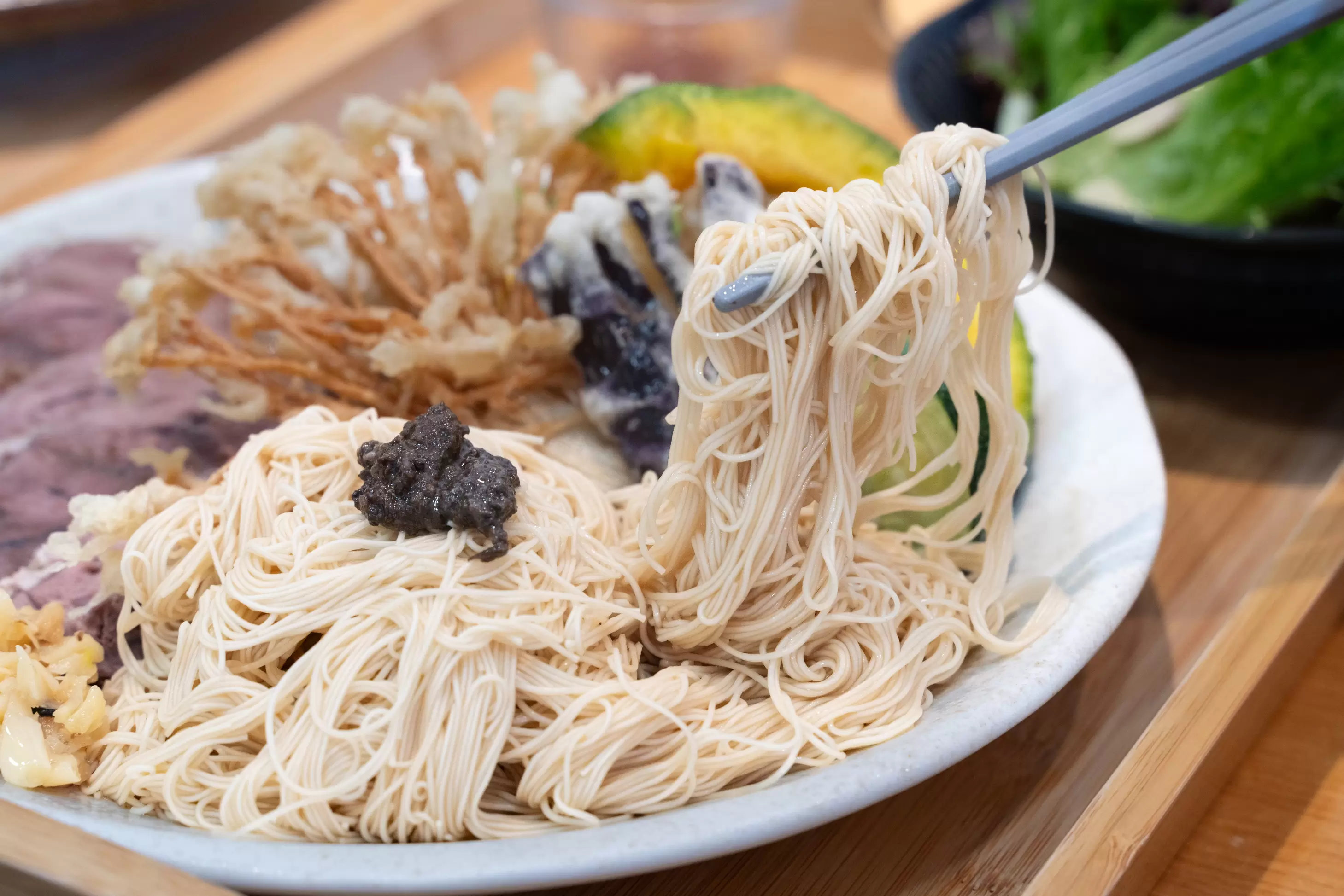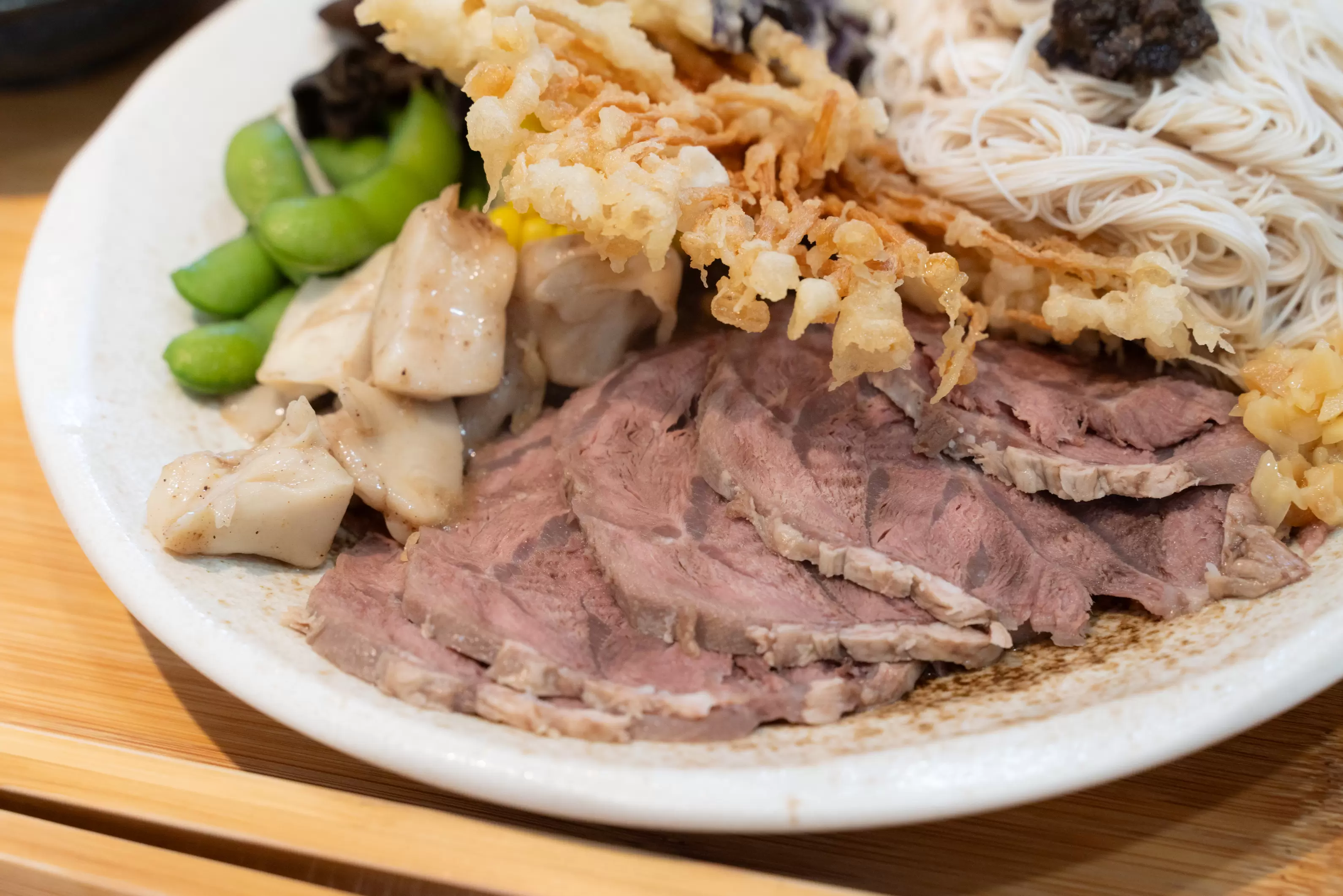 沿水牛腱松露奶油麵線:吃過後我得說中式麵線搭配西式松露,不愧是特色招牌,看似有點衝突,卻詮釋出令人驚喜的美味。松露奶油醬香氣撲鼻,搭上麵線拌勻,口味上更增添風雅層次,薄切牛腱也是令人驚艷,主廚細心長時燉煮,將肉質處理的細膩而軟嫩,一入口就帶來滿滿的幸福感。配餐中的炸金針菇與炸茄子,金針菇炸得絲絲分明,口感細膩炸茄子皮亮肉嫩每一口都是酥香與鮮嫩的極致體驗,我很喜歡。