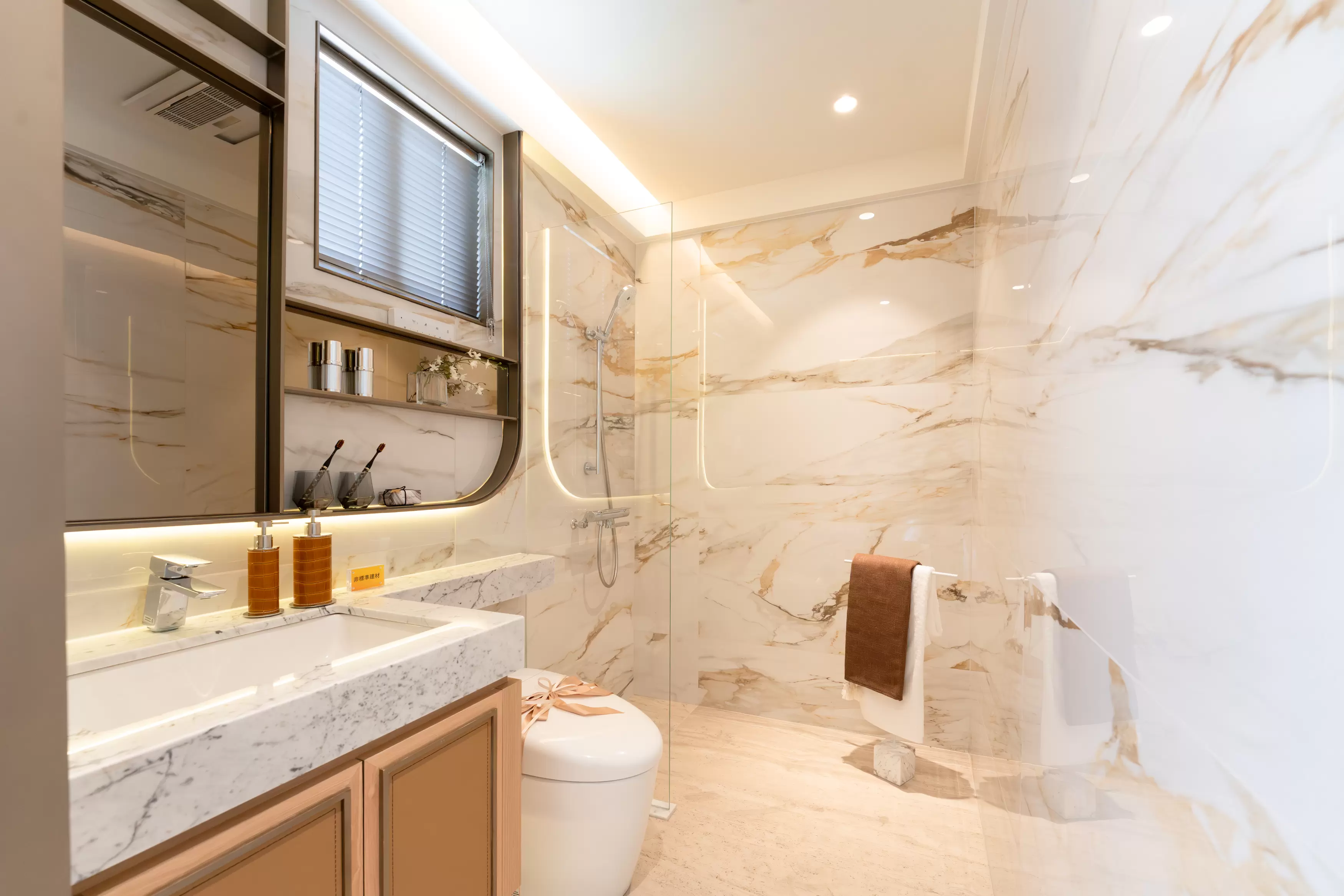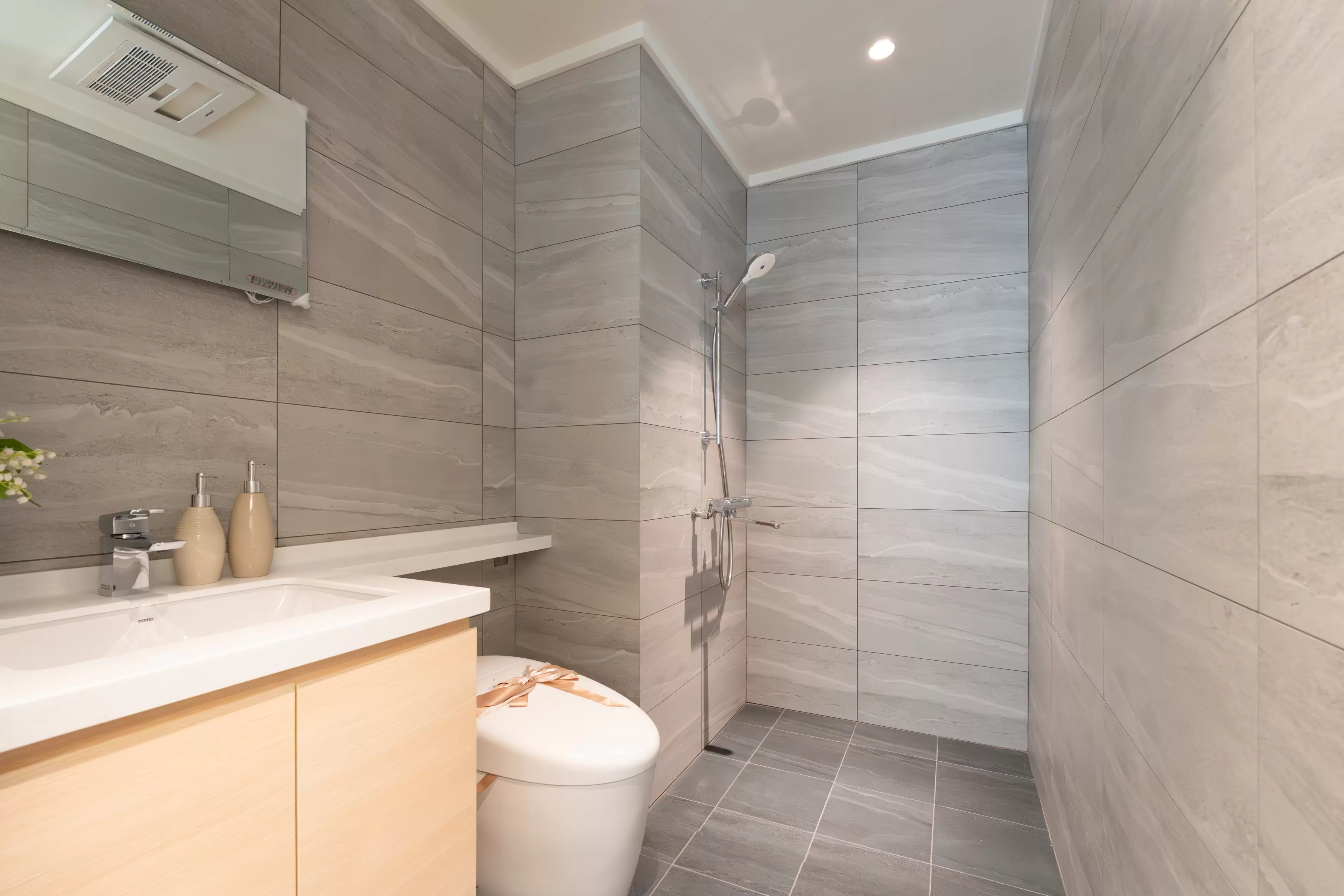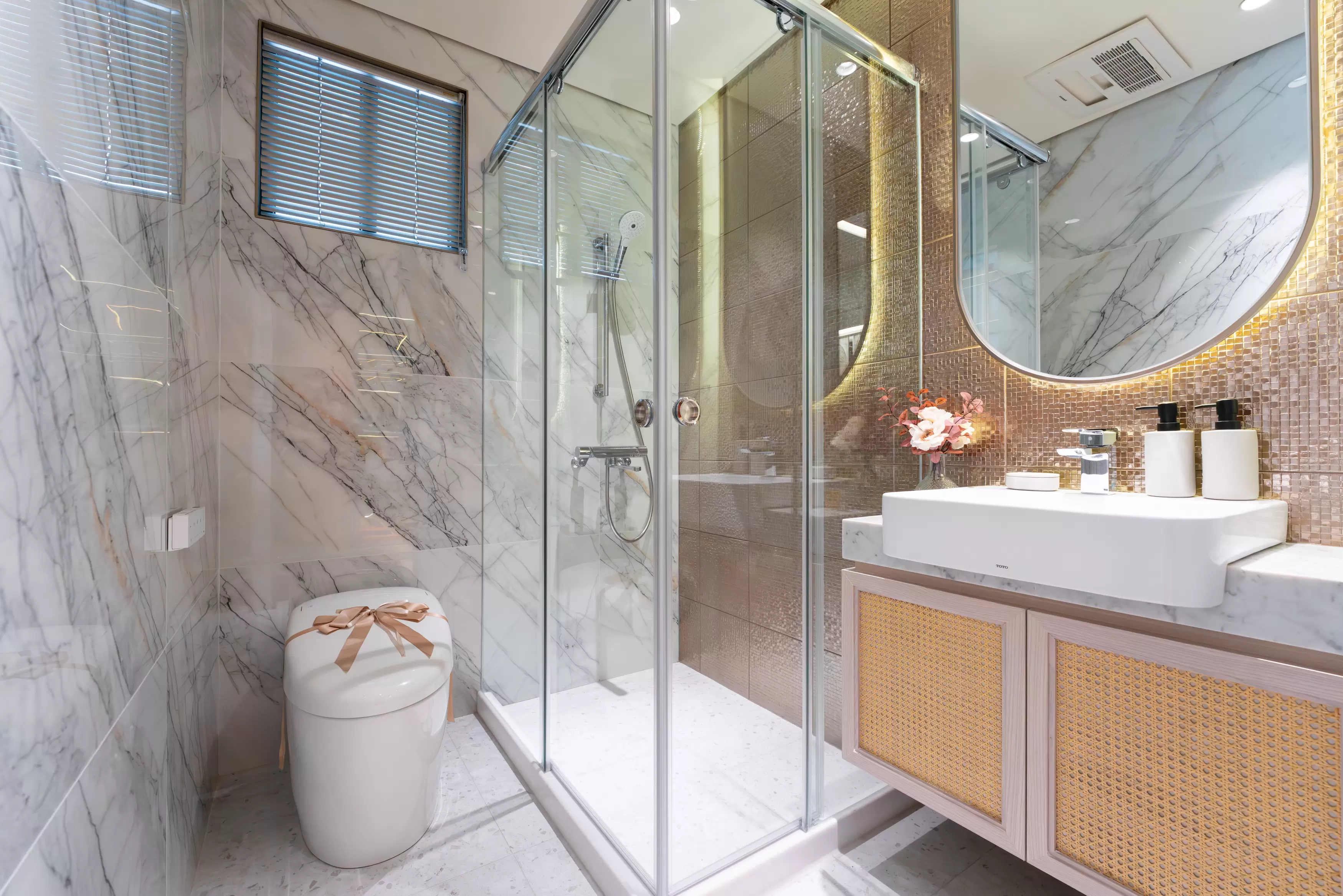 主臥衛浴有開窗,兼顧通風與採光。若欲參考浴室建材,客浴為主要展示空間。