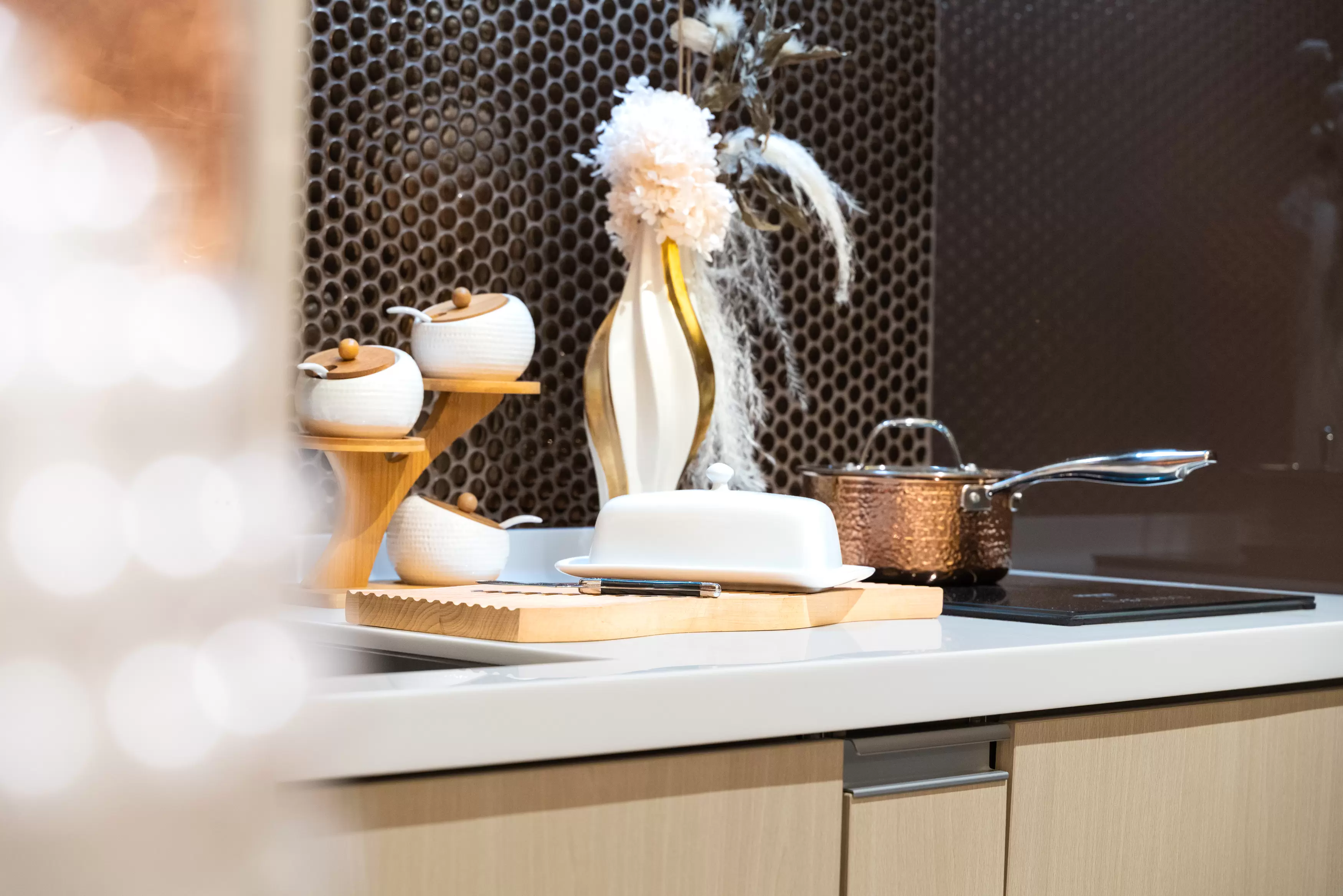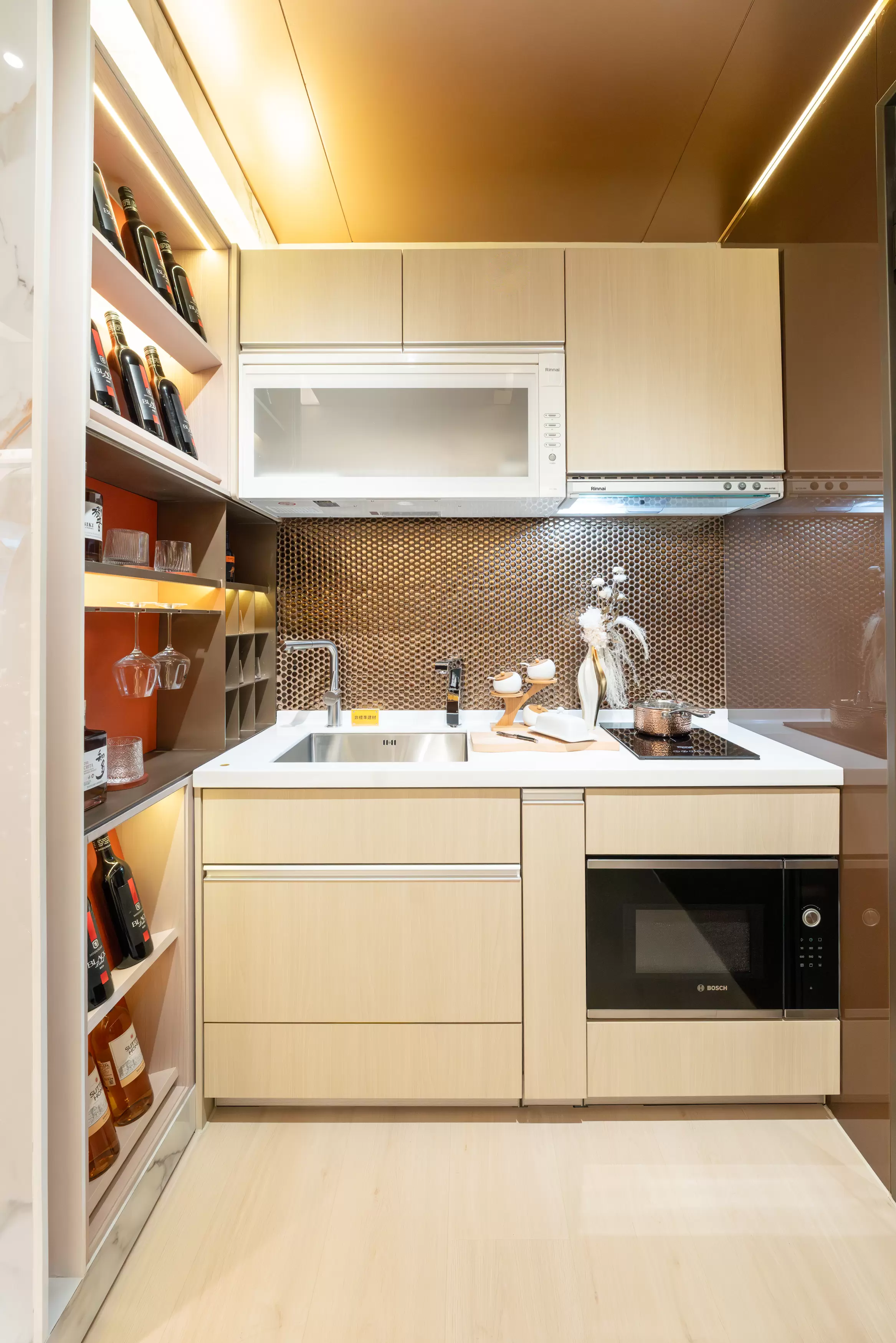 廚房採用IH爐火安全設計,搭配林內三機,還多了一台BOSCH微波烘烤爐,真的是誠意滿滿,同時轉角也有規劃冰箱擺放位置。