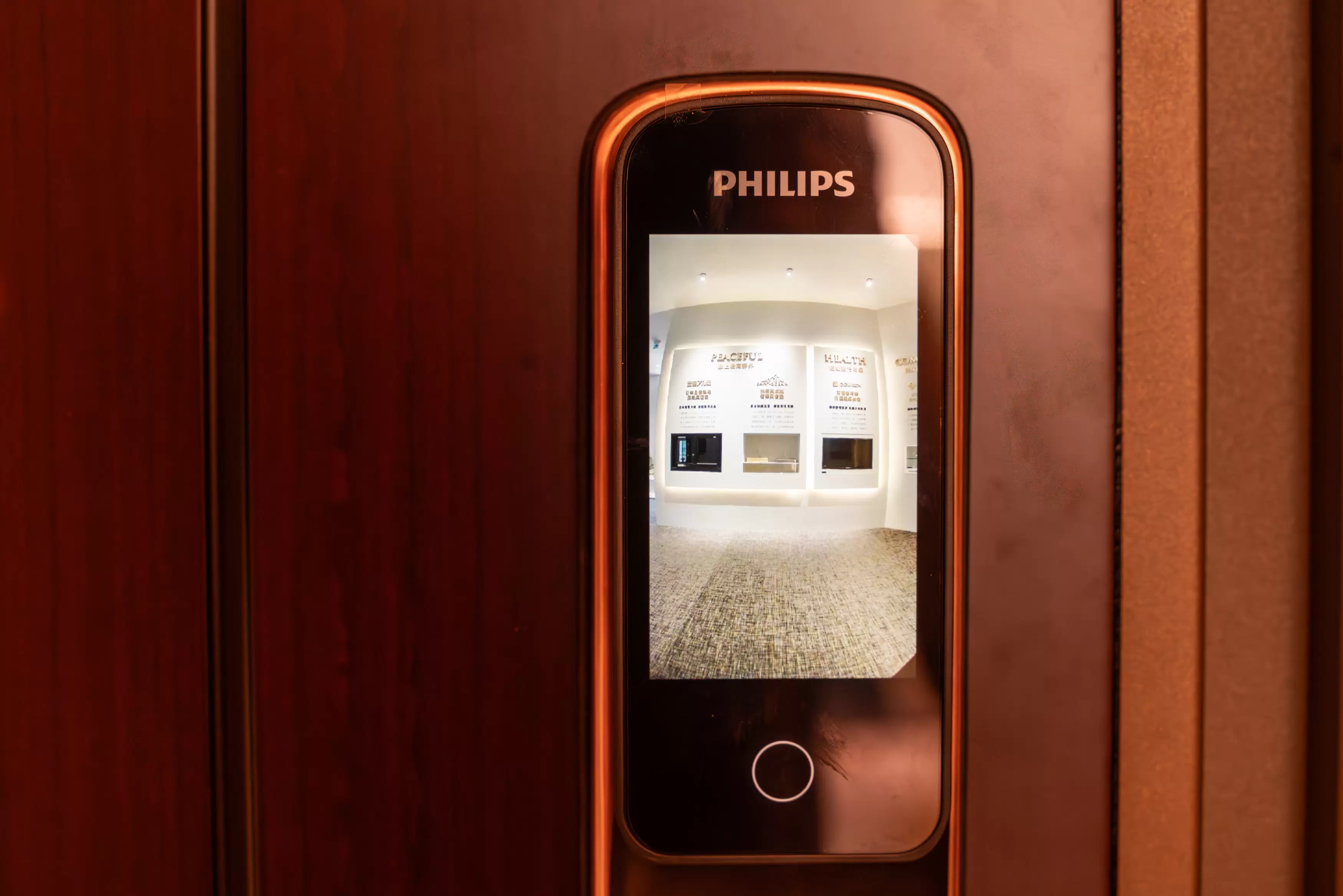 大門使用Philips多合一智慧電子鎖,附帶貓眼攝影功能,門鈴一按即能看到訪客影像,便利又安心。