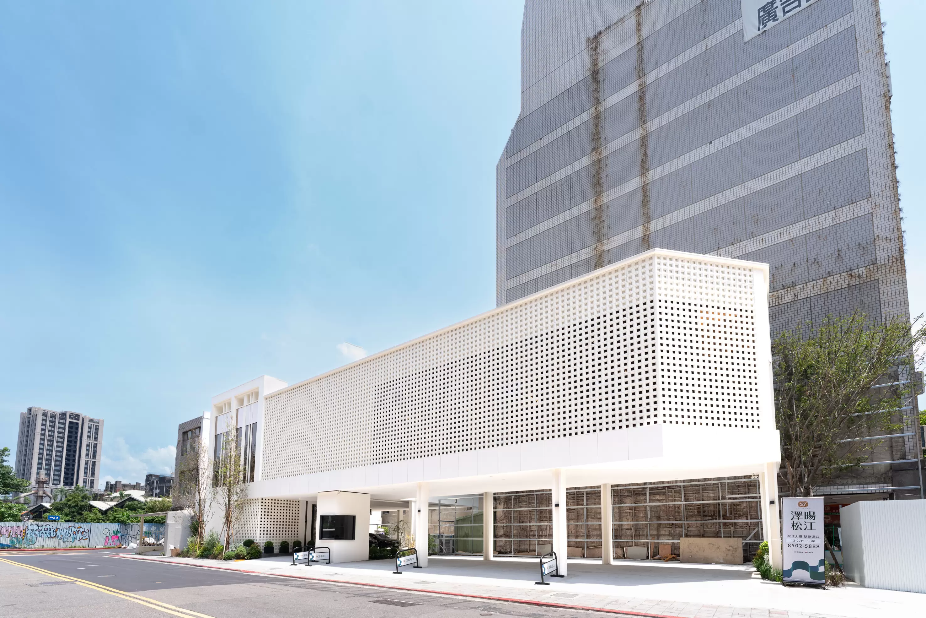 【澤暘松江】的接待中心就設立在未來基地上,外觀為一棟純白建築,臨松江路旁,位置十分好找,現場還備有專屬賞屋車位,開車前來賞屋也很方便。