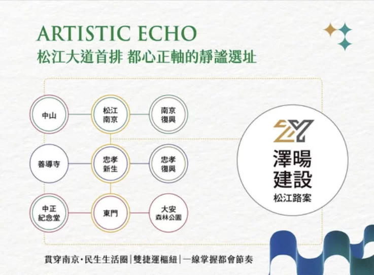 澤暘松江,坐落於台北市中心正松江大道首排稀有角地,地段條件優越,擁有雙捷運交會(松江南京忠孝新生)加持,周邊無高架橋干擾,是市中心少有的宜居地段。生活機能完整、交通便利,加上主打13至27坪、1至3房的小坪數精品宅,更是松江路上少見以親民總價就能入主的精緻住宅。無論是首購族自住客、退休樂齡族都會小家庭,都能在此找到兼顧質感與地段的理想生活提案。