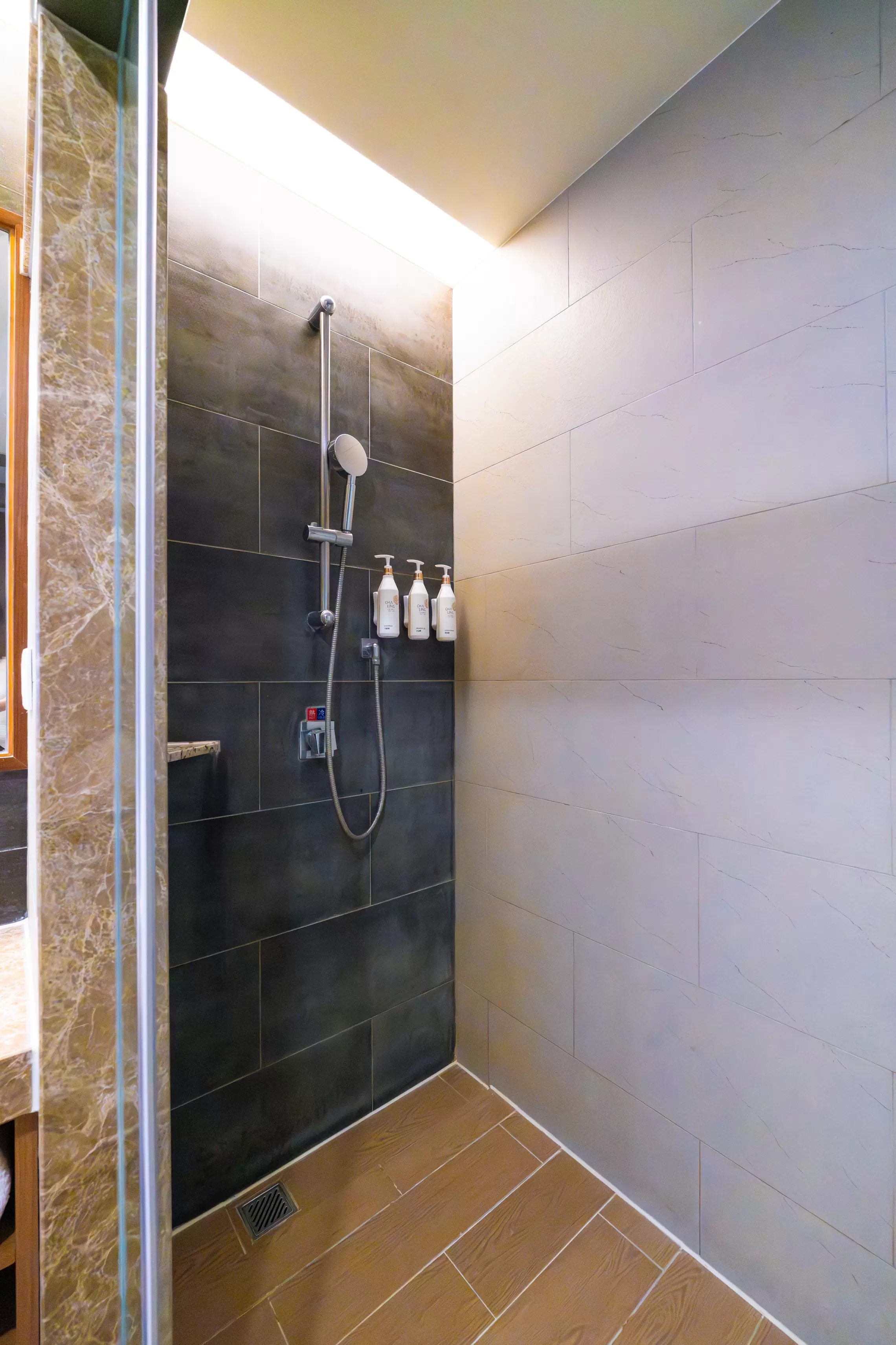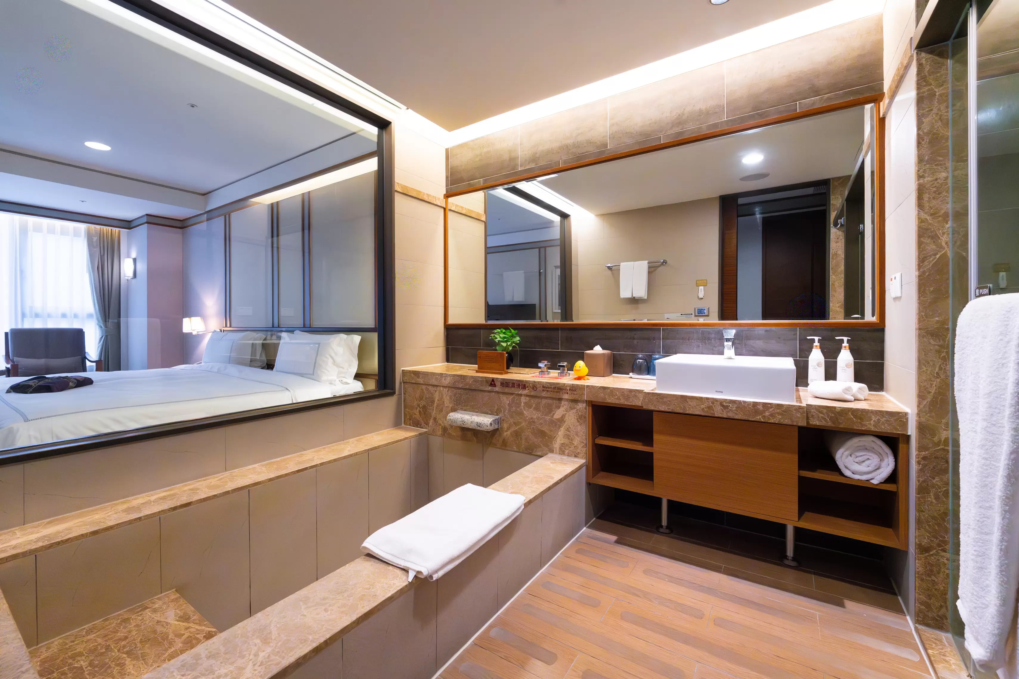 浴室不僅有淋浴間,還有大浴池,並設有電動遮簾與音樂播放功能。