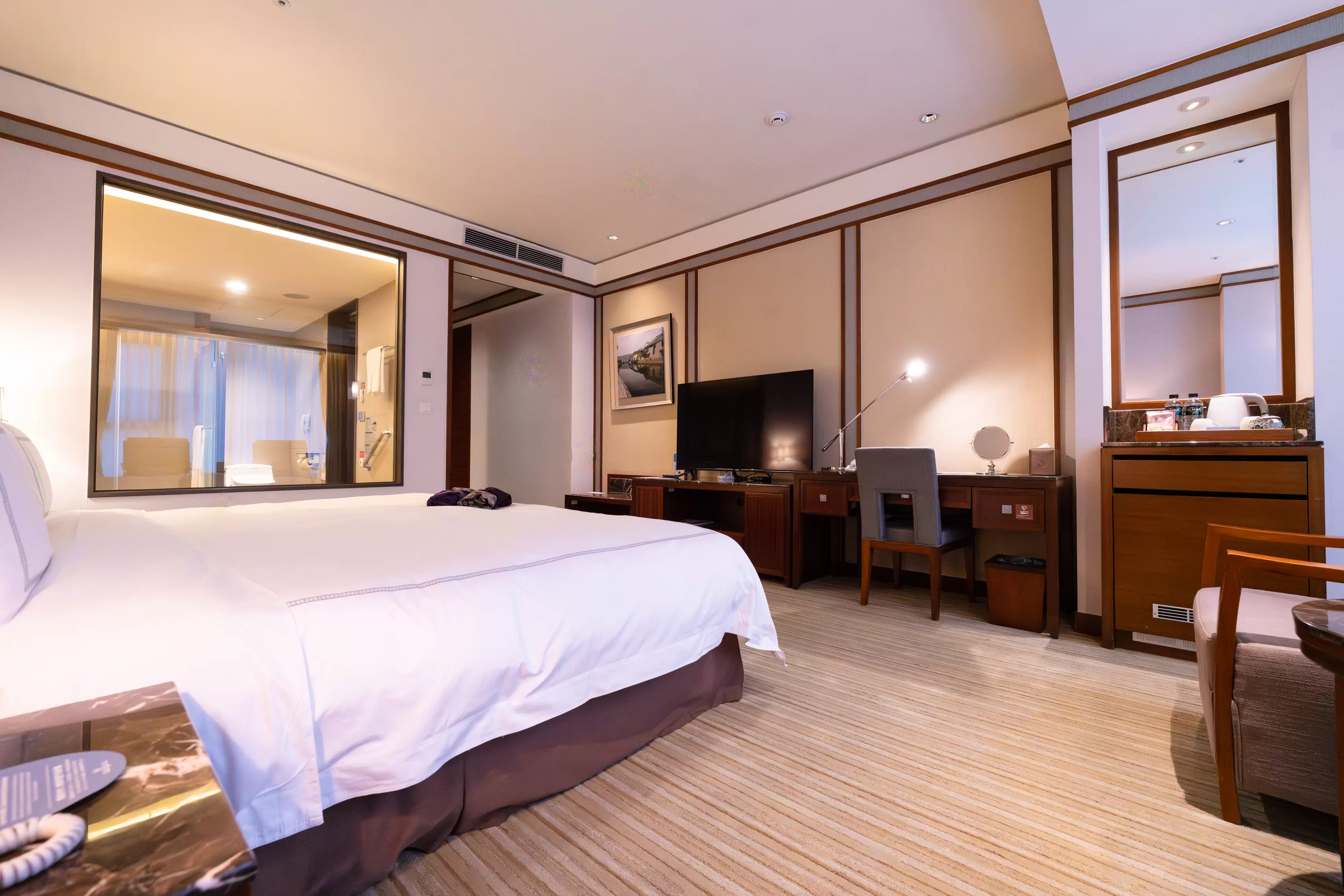 回到房間部份,我們這次入住高級洋式客房,房內配有超大雙人床與寬敞空間。冰箱備有各式飲品與點心,從落地窗俯瞰泳池,畫面如同水族箱中魚群悠遊,旅人也成了度假風景的一部分。
