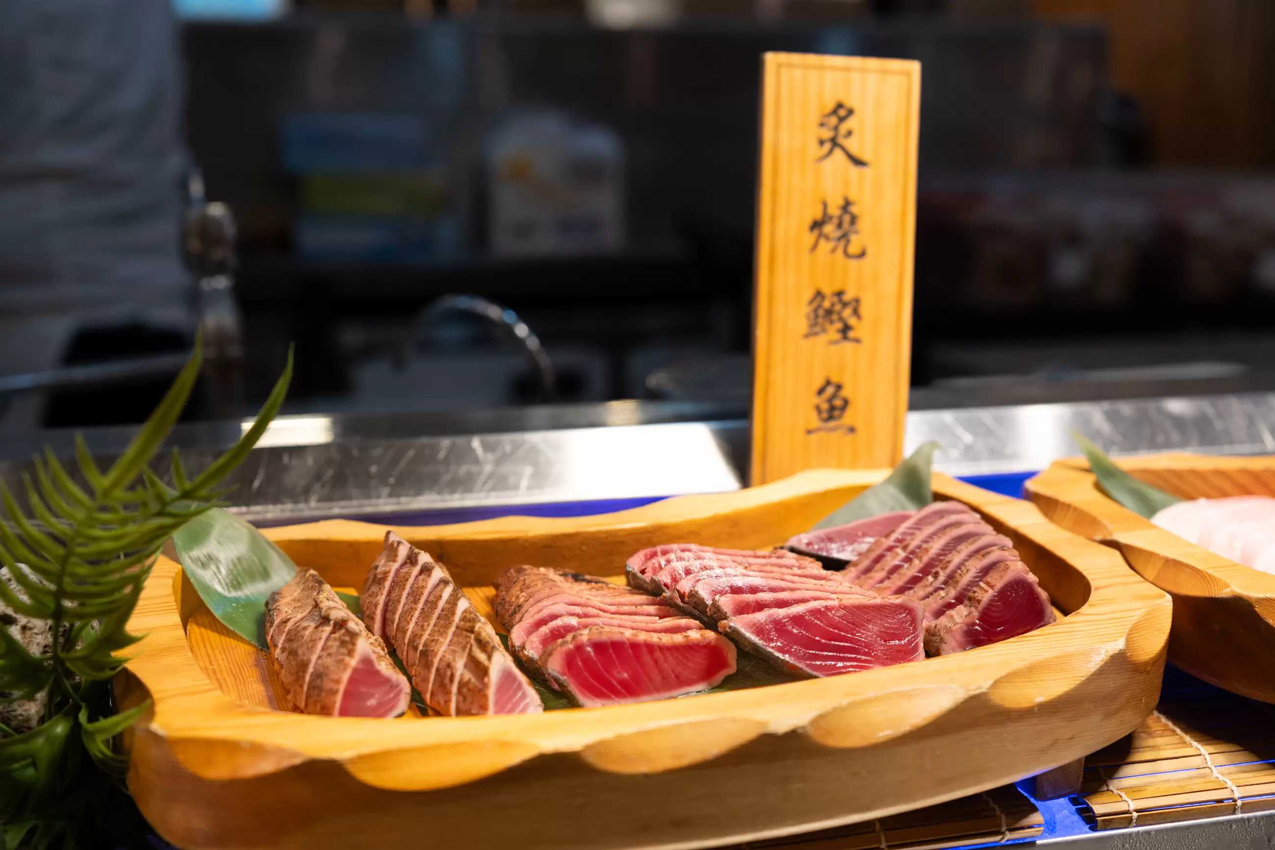 生魚片區也是老饕們第一鎖定的戰場。現場由師傅即時切片擺盤,新鮮度與光澤一目了然。我自己主攻鮭魚生魚片油花分布均勻口感滑嫩鮮甜,彷彿在口中化開。炙燒鰹魚也大推吃起來外香內軟,略帶炭烤香氣。