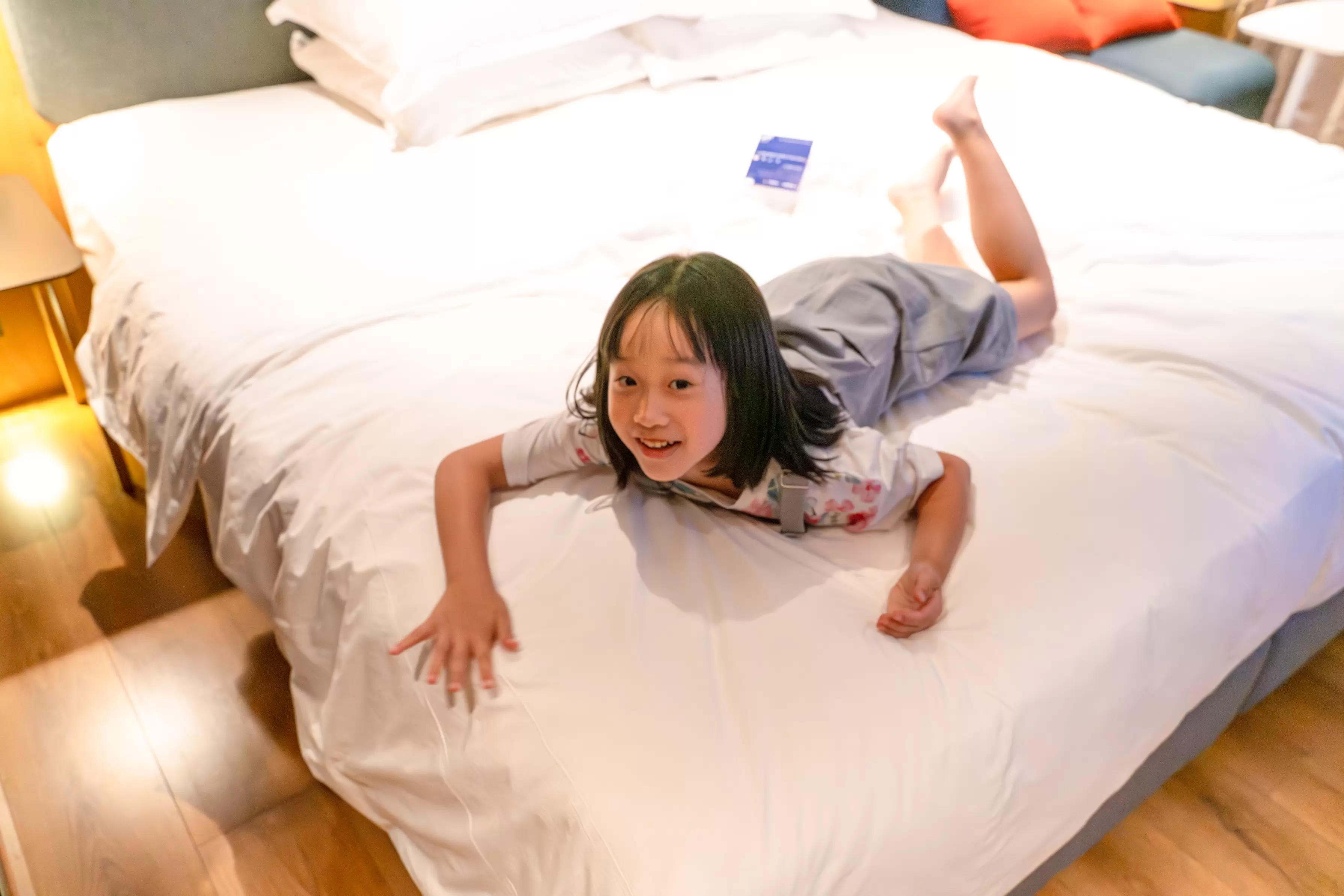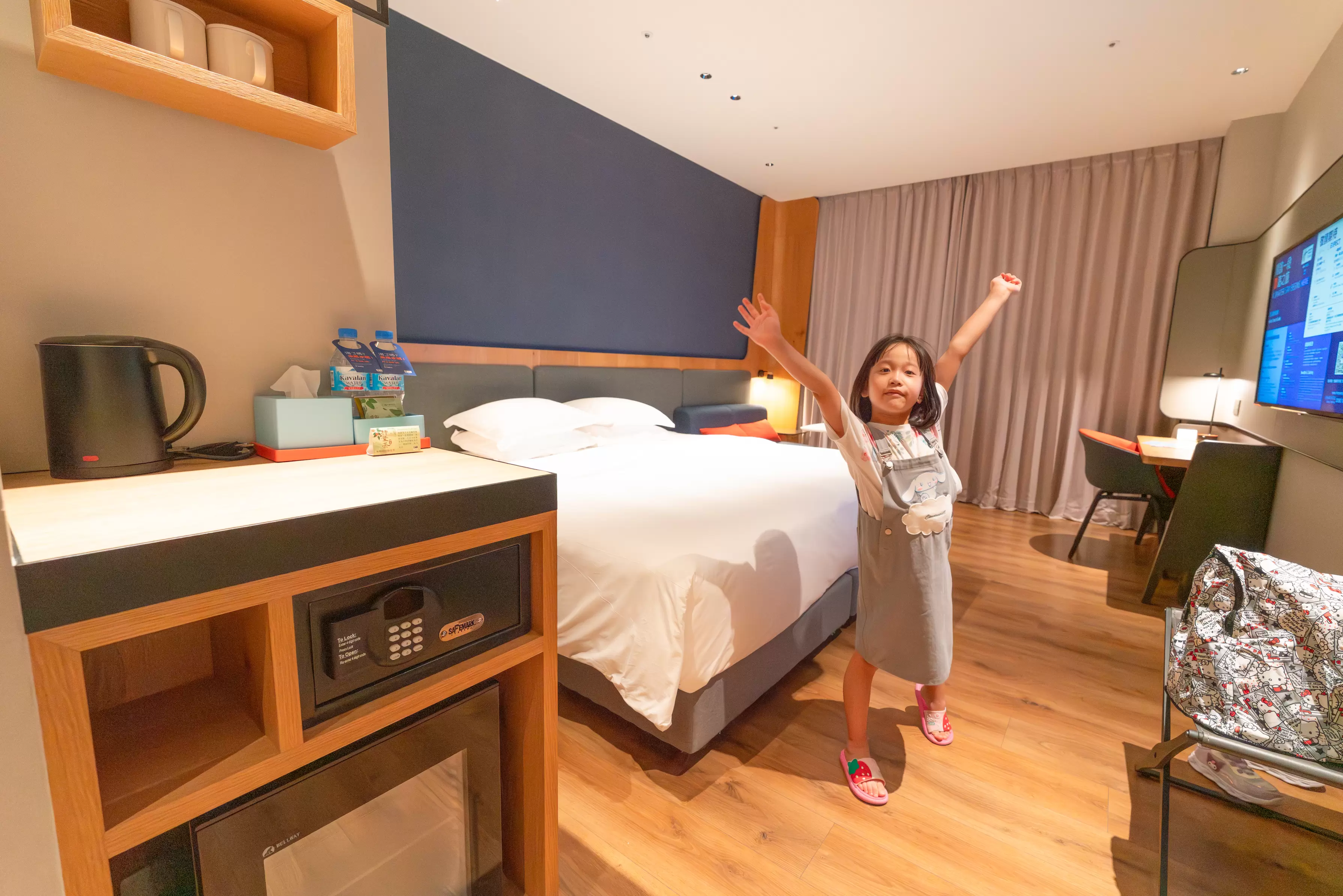 這次我們入住的是特大床房型,房間大小約8坪,空間相當寬敞。有戶外大陽台、跟躺起來超舒服的席夢思床,還有書桌與小沙發區。我跟女兒住一間,空間綽綽有餘。