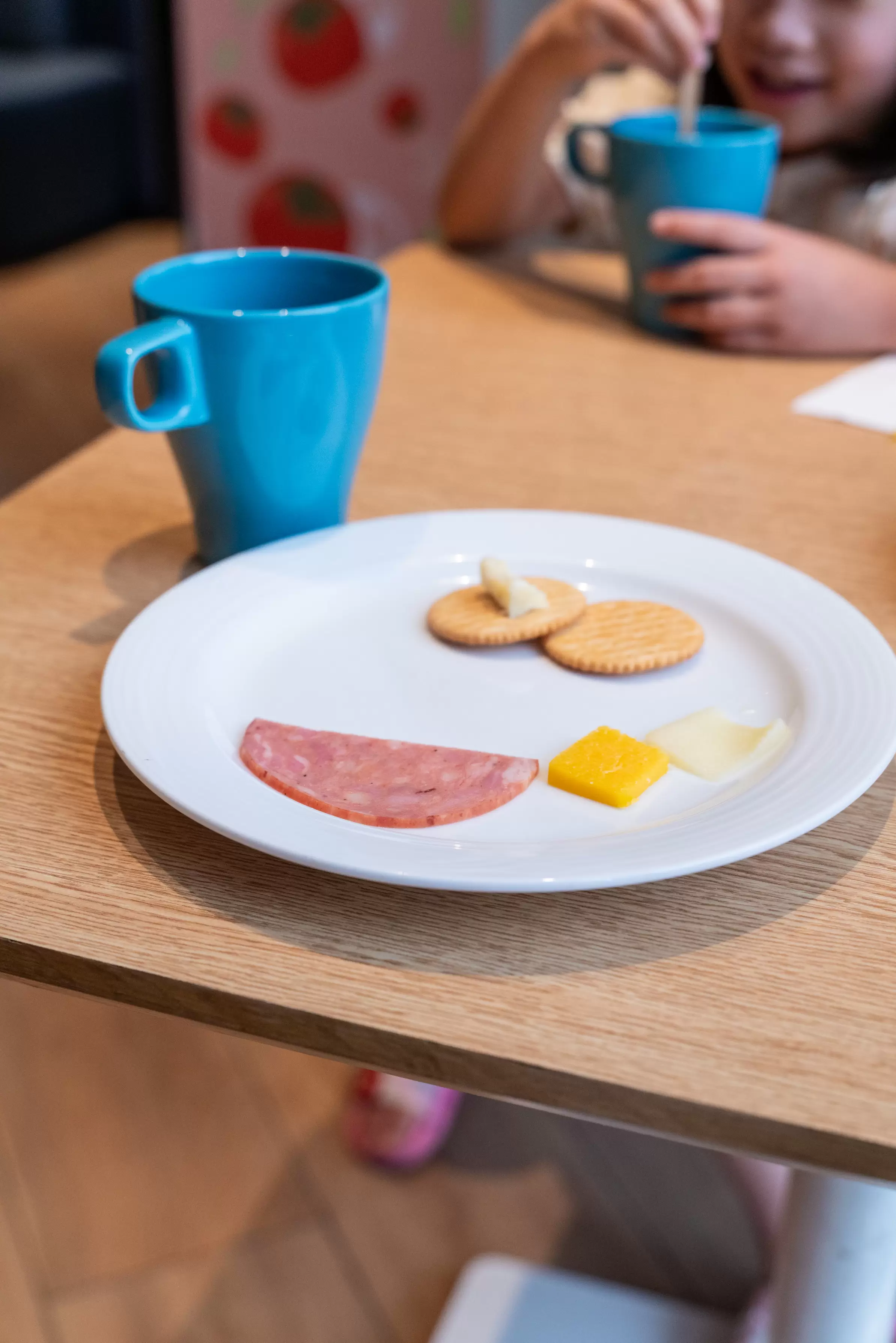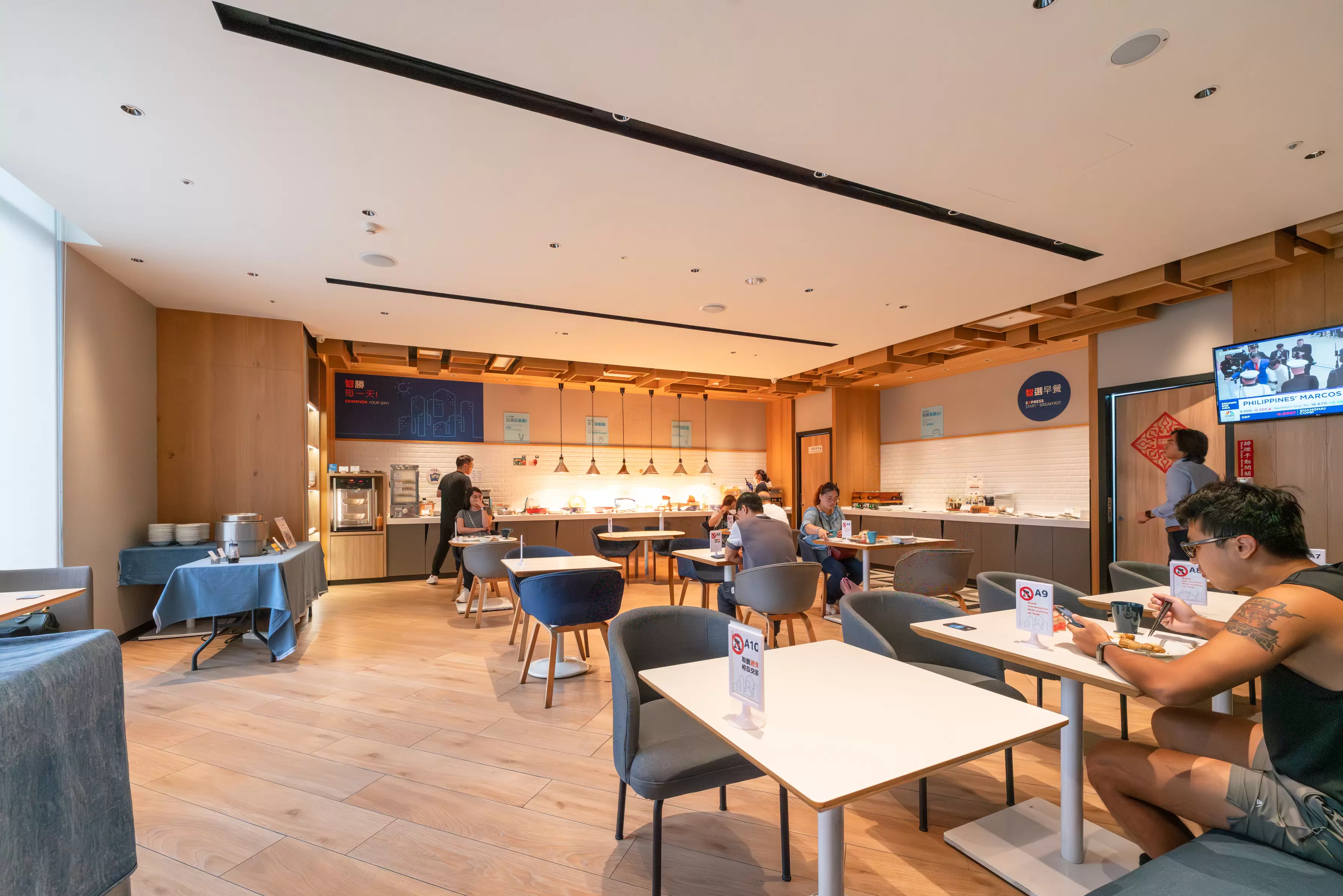 隔日的早餐在二樓享用,就是我們前一天下午喝下午茶的同一個區域。空間的顏色設計很繽紛,紅配藍色搭配許多幾何圖形,讓人在早上用餐時心情也跟著雀躍起來。