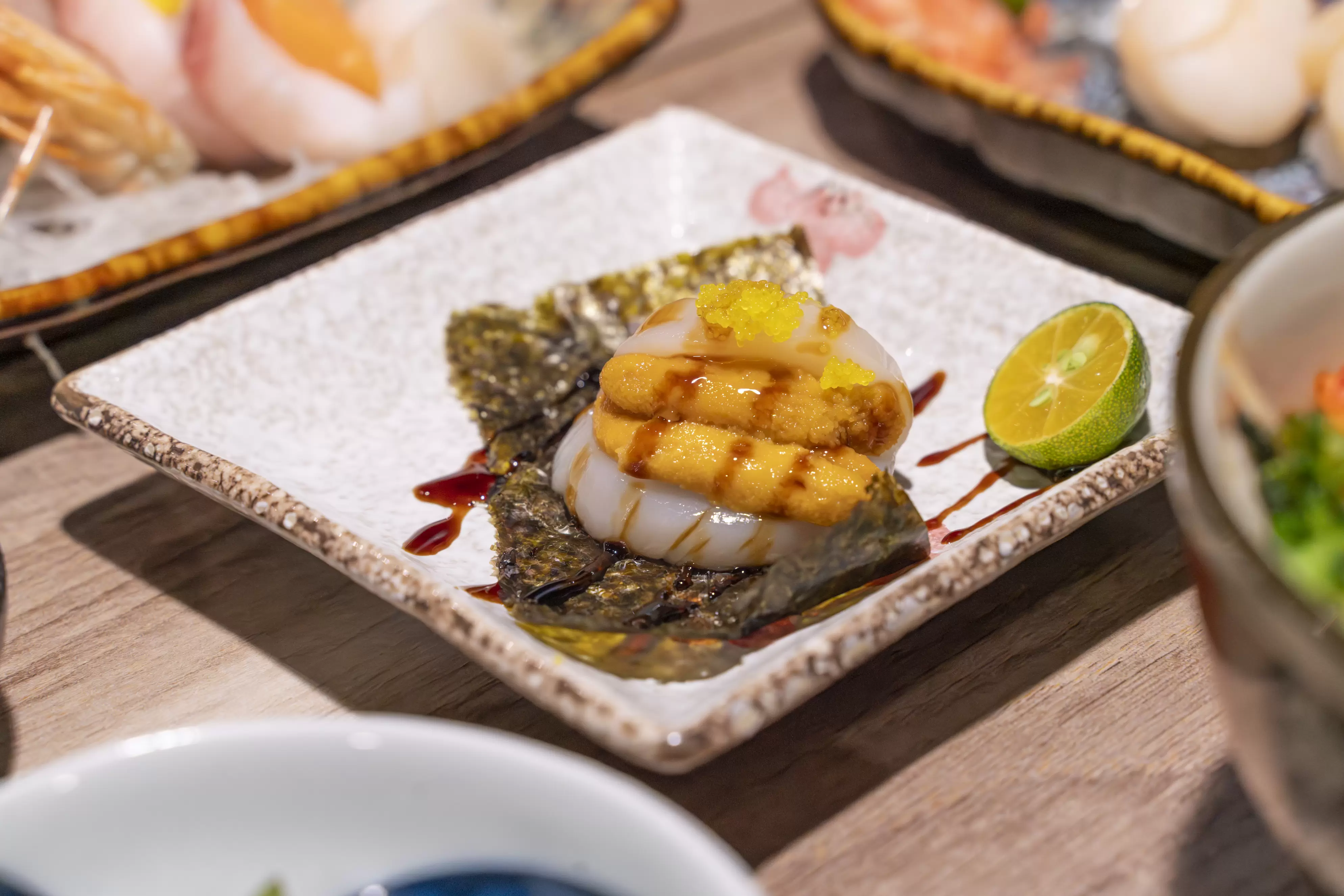 每次吃日料如果菜單上有干貝握壽司,都是我必點的選項之一呢! 干貝有微炙燒處理,釋放淡淡焦香,咬起來內裡仍保有生食的柔嫩與鮮甜,搭配微酸的醋飯一同入口,仿佛海浪拂過味蕾,清雅又迷人。