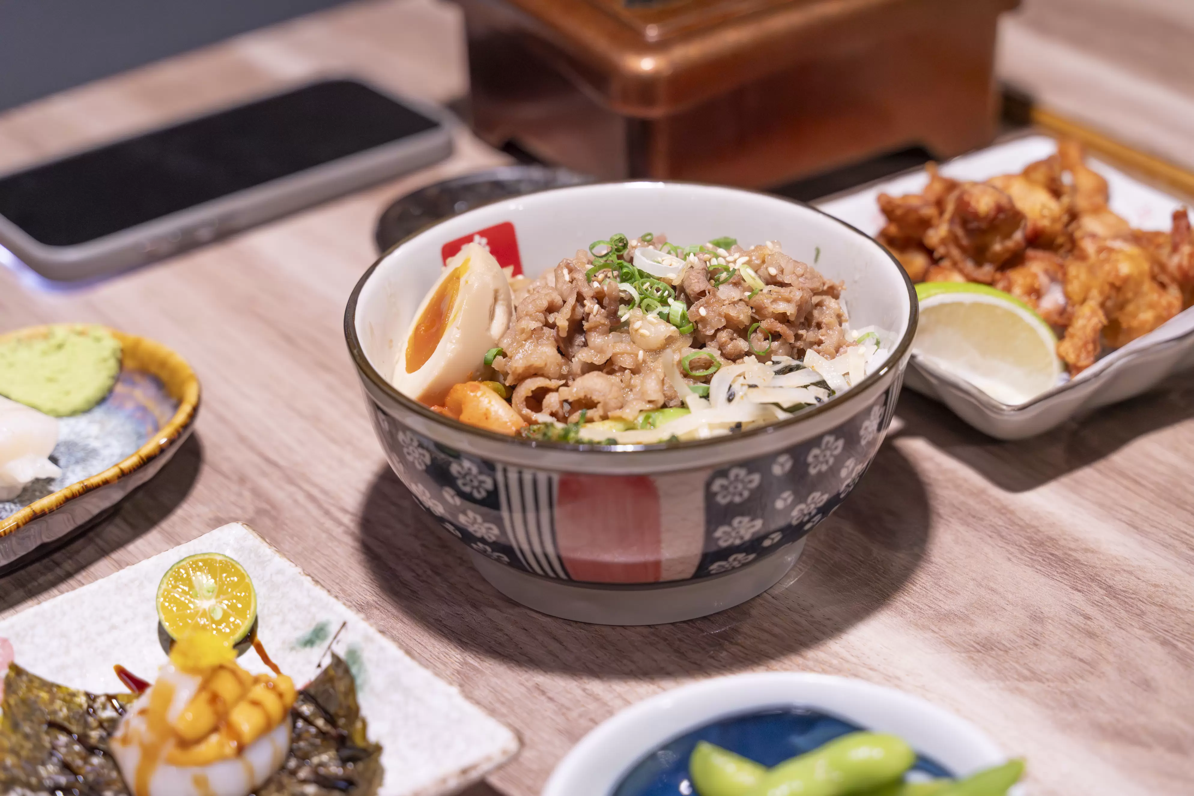 這次帶著家人,來小原田日本料理聚餐。一走出電梯,迎面而來的畫面,是靛藍色牆面襯著「小原田」的白字相當醒目,燈籠高掛,櫻花圖樣在紅白紙燈籠間搖曳,旗幟與浮世繪海報交錯,整個空間洋溢著濃濃日式居酒屋風情,像是瞬間走進了東京某條熱鬧小巷中的老屋,每一眼都是驚喜。