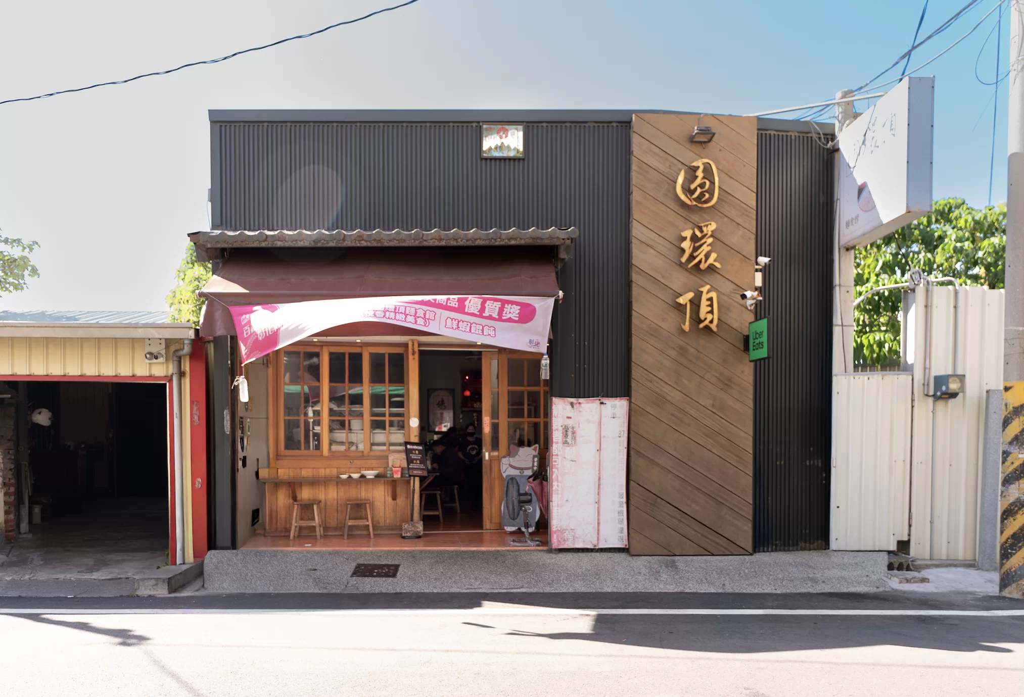 圓環頂麵食館的外觀是深色為主體,搭配日式木屋的設計,立面上還有大大「圓環頂」三個字。非常好認,也很有特色。