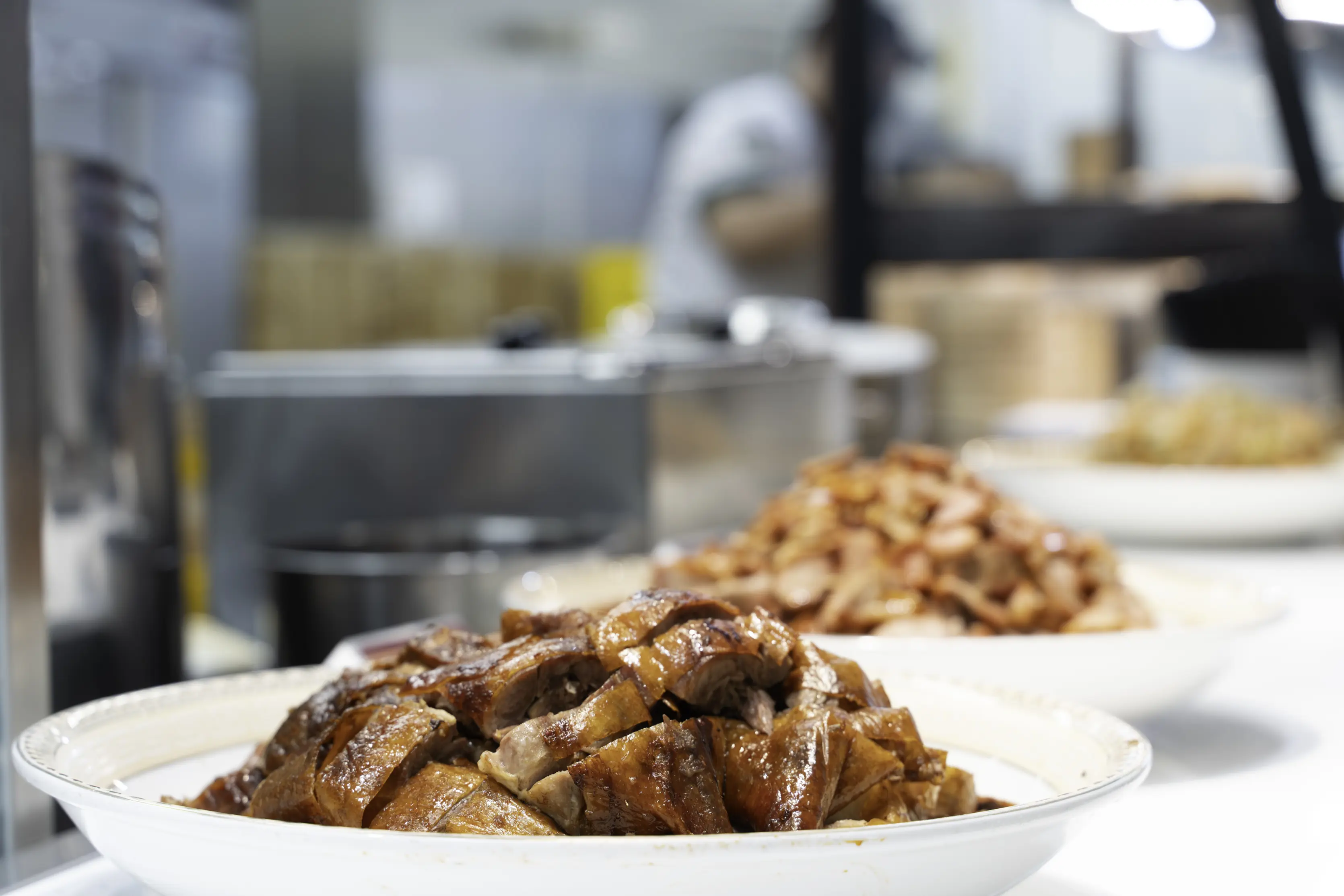 燒鴨燒臘區幾乎是全場人氣最高的一區。透明櫥窗裡掛著一隻隻油亮的燒鴨,師傅現場片鴨、剁鴨裝盤。片好的燒鴨還會用餅皮包覆、再加熱保持溫度,片鴨真的建議趁熱吃,一入口鴨皮還會喀滋作響,油脂香氣立刻在嘴裡化開,鴨肉嫩到出汁,真的很療癒。