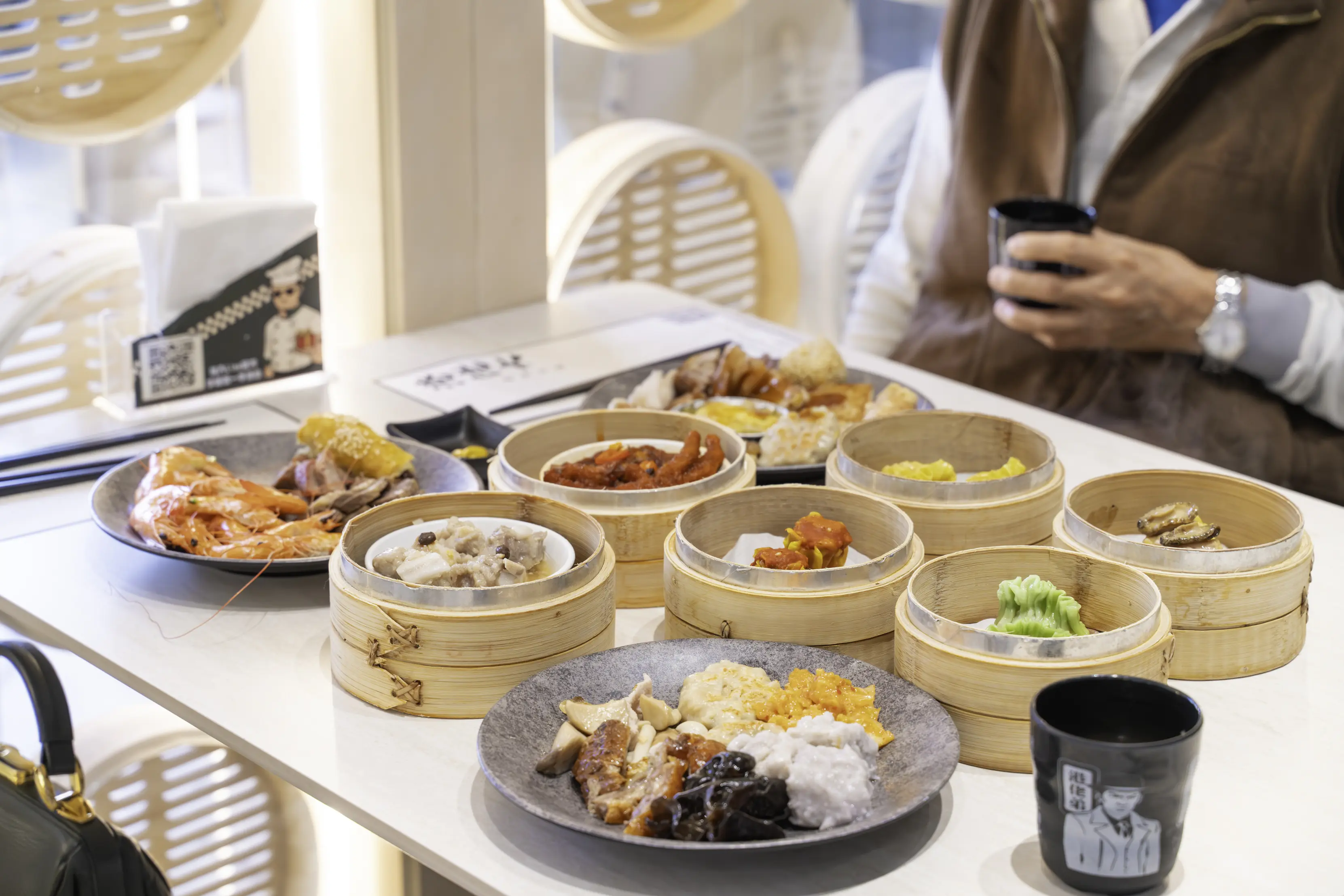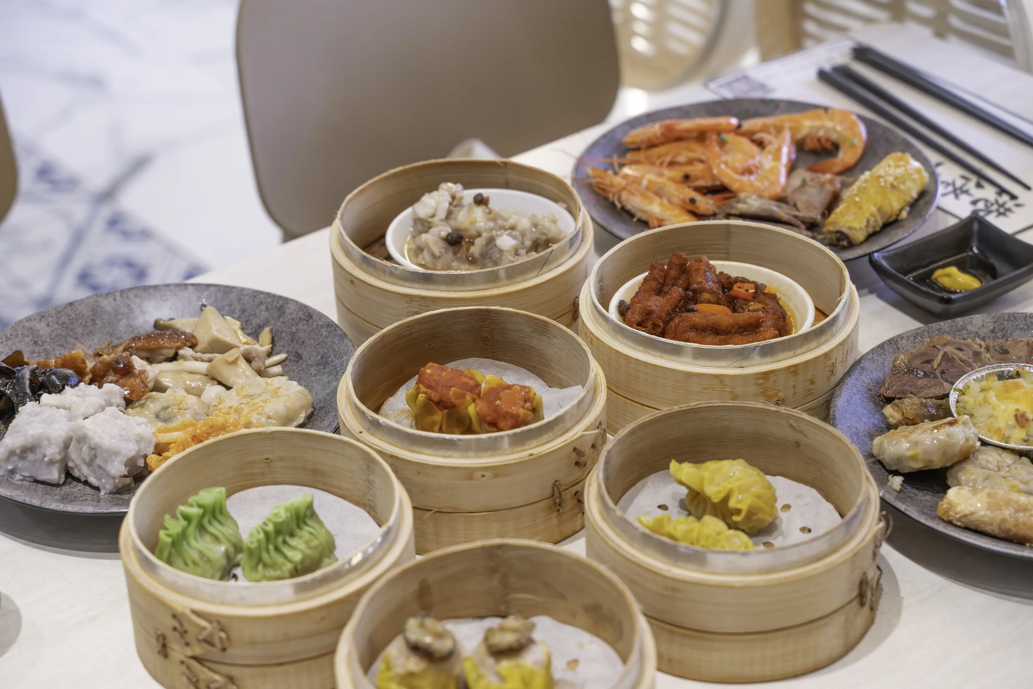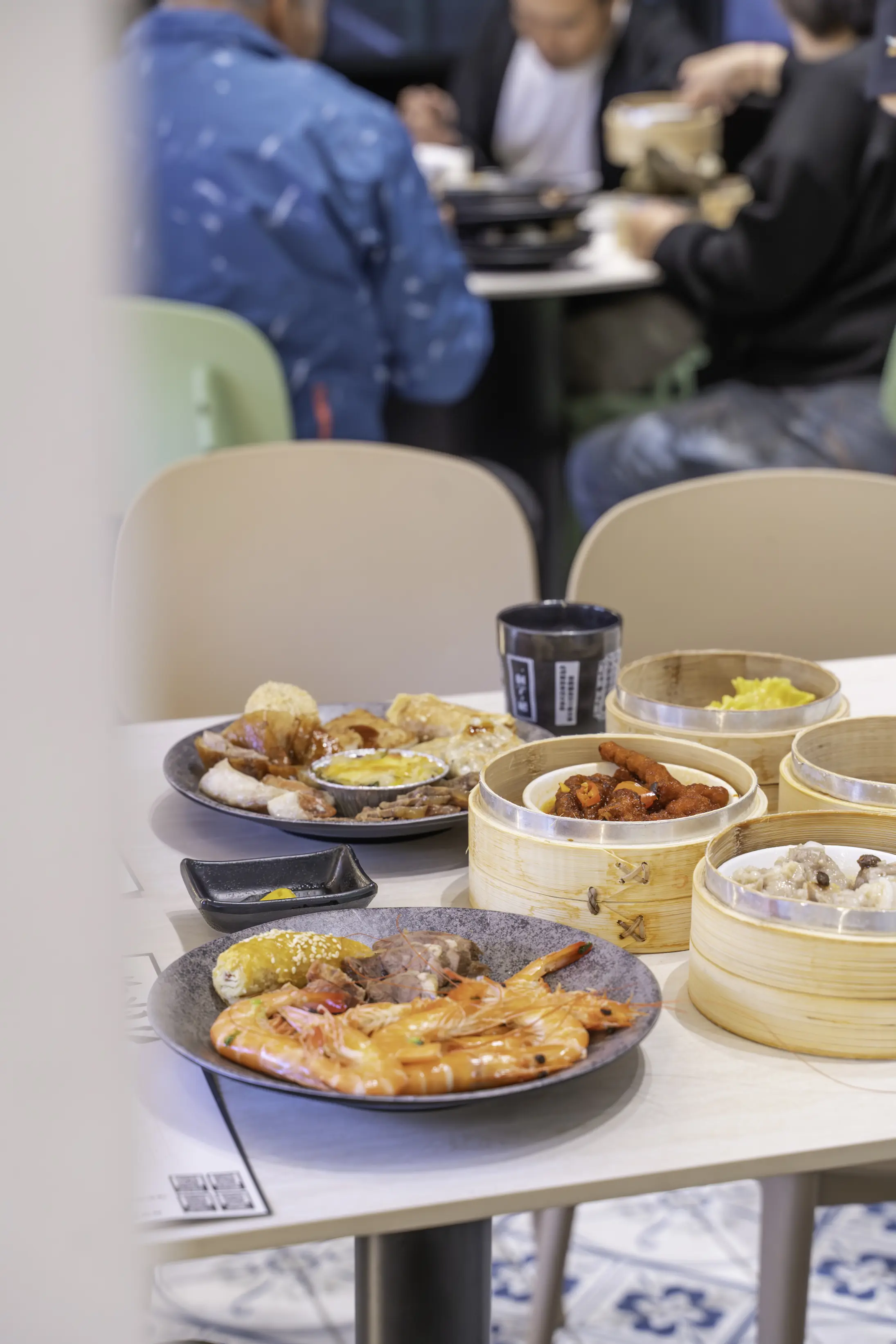 取好第一輪餐點回到座位,桌上瞬間被蒸籠與盤子佔滿。香煎花枝排外酥內彈、鮮蝦腐皮捲酥脆不油;燒鴨、牛腱、薑絲蛤蠣湯,每一道都吃得到誠意。冰心芋頭綿密細緻,豆沙芝麻球外脆內香,當甜點收尾剛剛好。